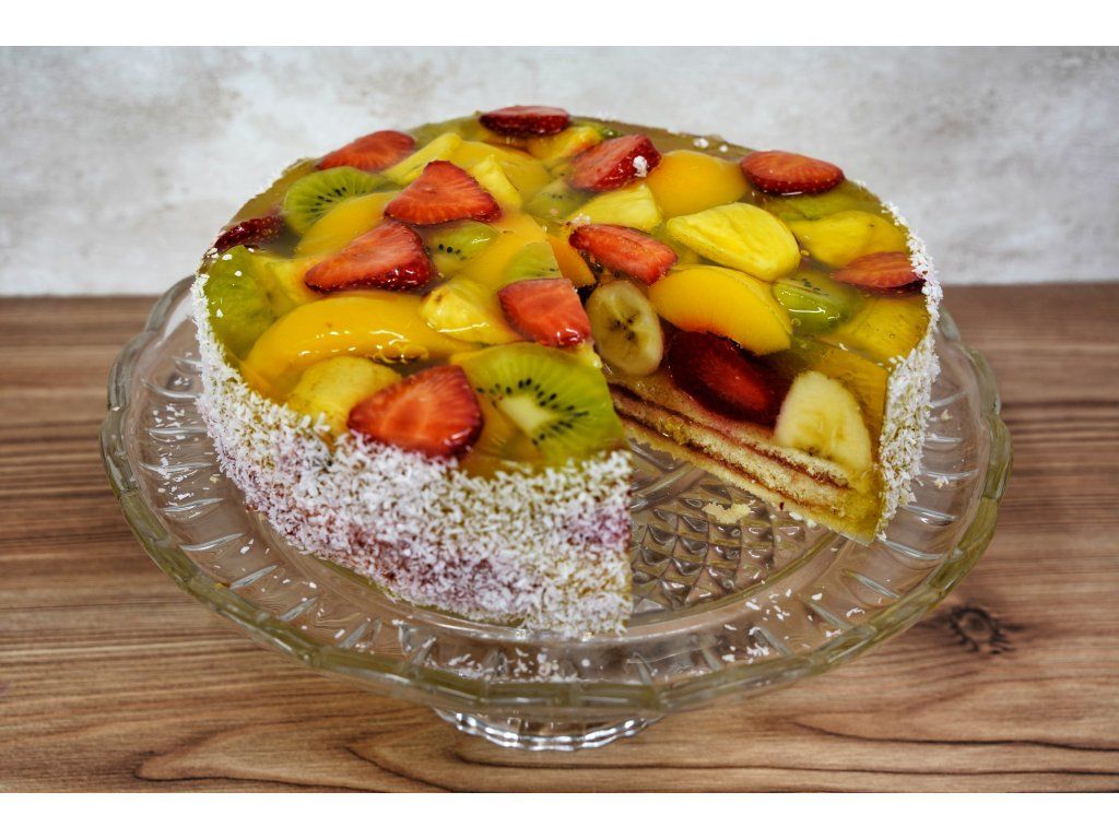 Složení: jahody, kiwi, ananas, broskve, agarová poleva, světlý bezlepkový korpus a marmeláda, kokos