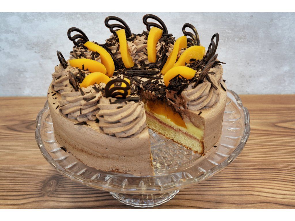 Složení: světlý korpus, pařížská šlehačka, broskve, dort dozdobený broskvemi a vše posypáno čokoládovými hoblinami