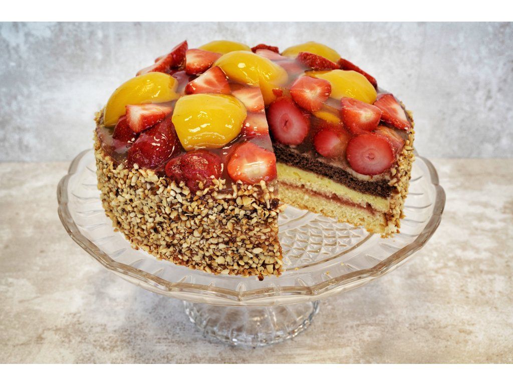 Složení: jahody, broskve, vanilkový krém, agarová poleva, světlý + tmavý korpus, marmeláda, pražené mleté lískové oříšky