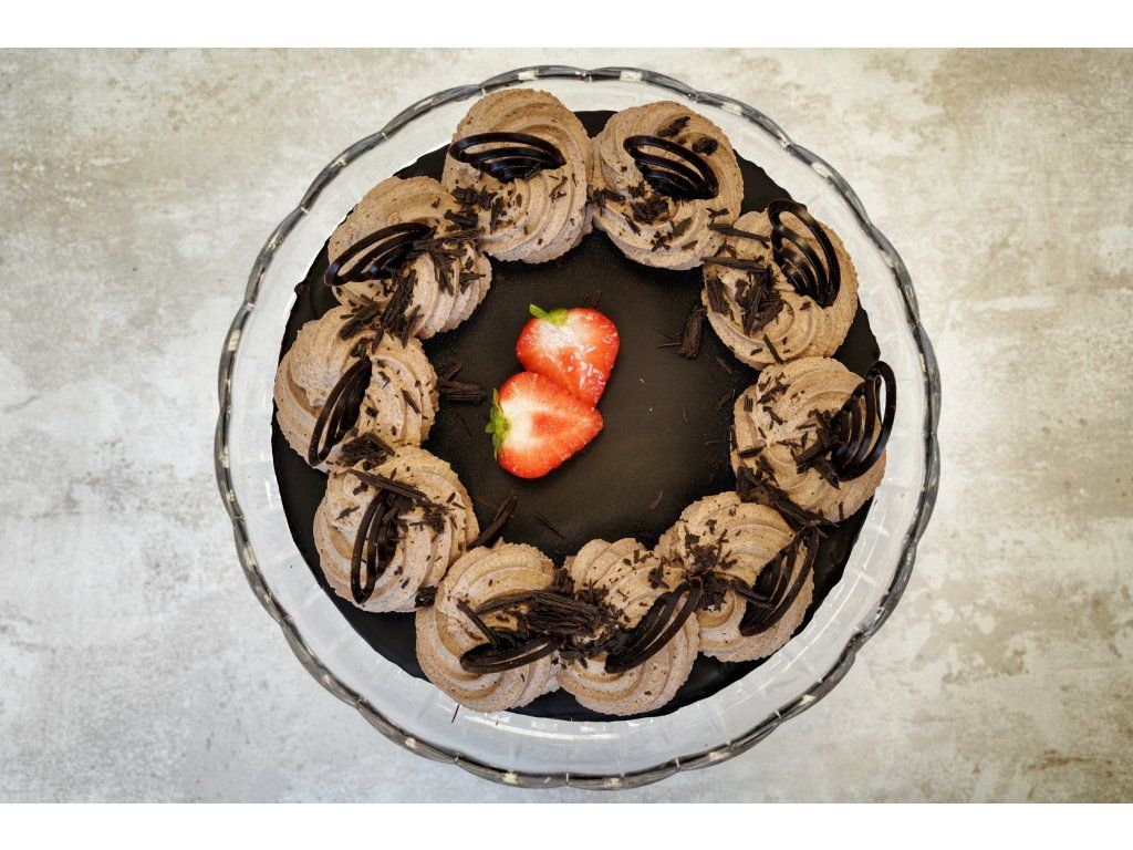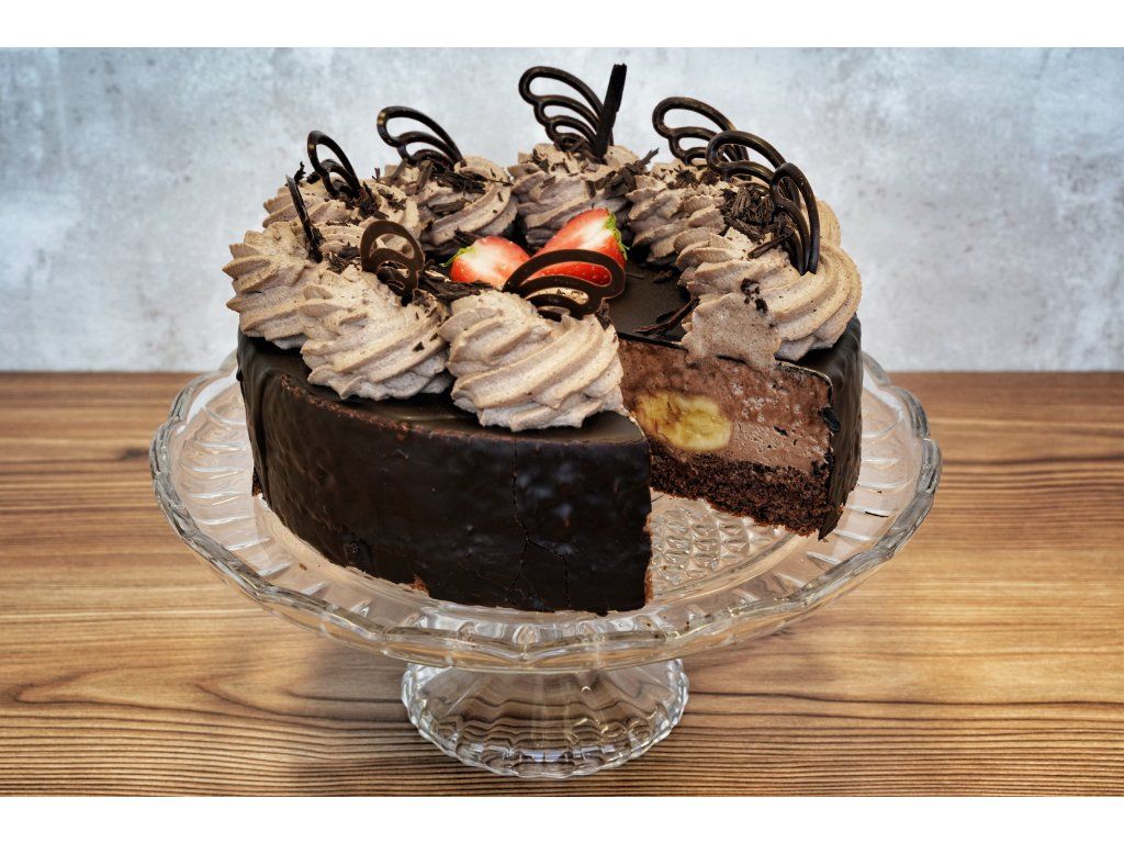 Složení: tmavý korpus, pařížská šlehačka, marmeláda, dort proloženy banány a zalitý čokoládovou krustou, dozdobeno čokoládovými hoblinami