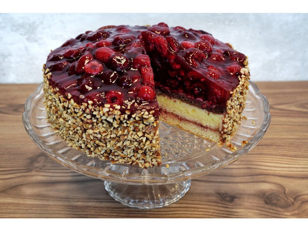 Složení: maliny, vanilkový krém, agarová poleva, světlý + tmavý korpus, marmeláda, pražené mleté lískové oříšky