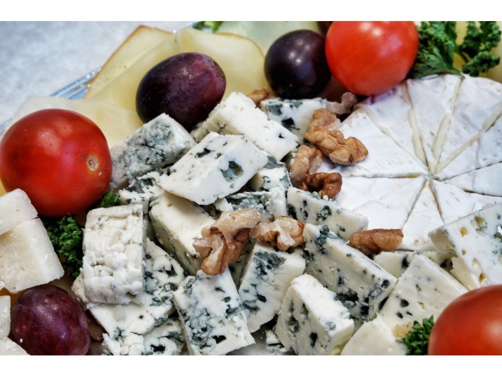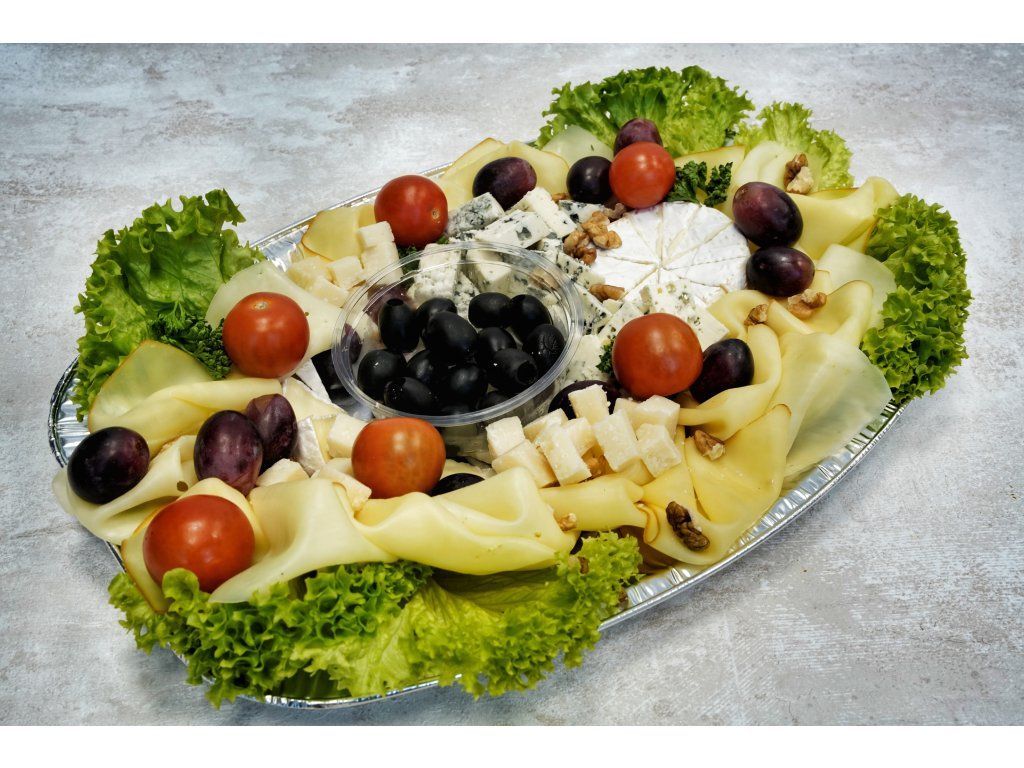 Složení: eidam uzený, eidam klasický, hermelín, niva, parmezán, cherry rajčata, salát biondo, vlašské ořechy, olivy, hroznové víno