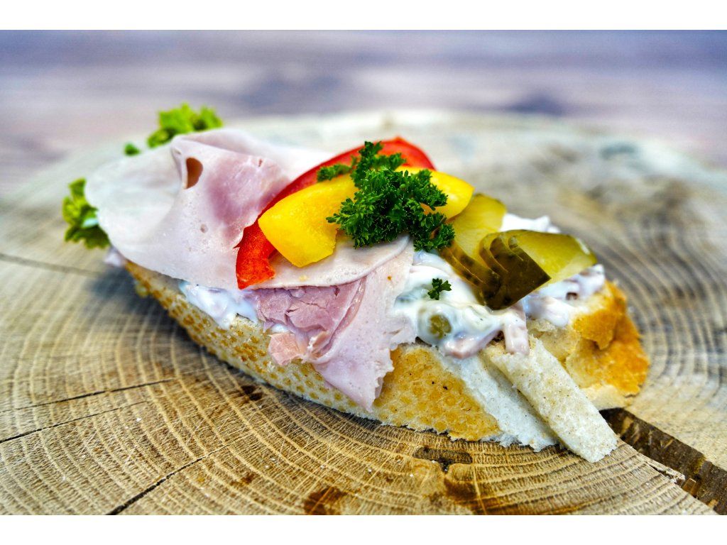 Složení: veka, pochoutkový salát, biondo, kudrnka, paprika, kyselá okurka, šunka