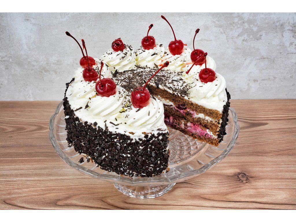 Složení: tmavý korpus, živočišná šlehačka, višně, marmeláda, čokoládové hobliny