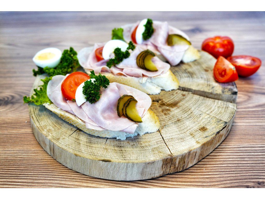 Složení: veka, máslo, biondo, kudrnka, rajče, vejce, kyselá okurka, šunka
